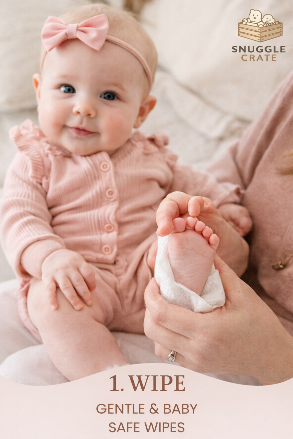 1. Gently wipe your baby’s hand or foot using the inkless wipe provided.
